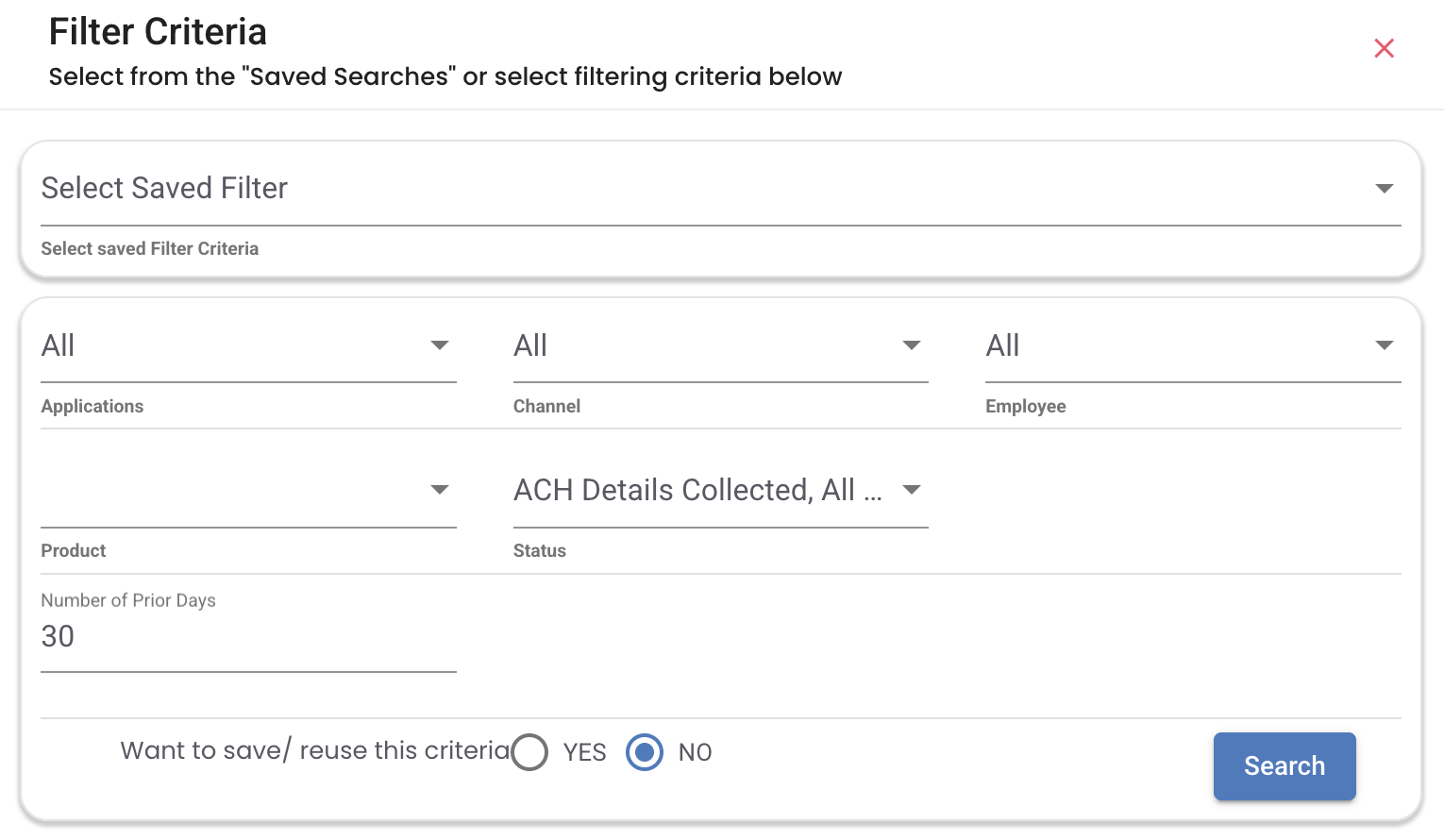 Application Status - Specify applications under a specific status (e.g. ACH Details collected, Approved, Documents Requested, etc.)